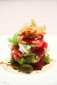 Cronaca di un pomeriggio molto speciale. Ottobre 2010: per una serie di curiosi motivi io e Sonia ci ritroviamo a passare qualche ora con Claudio Sadler, nel suo ristorante. Due stelle Michelin di passione, tenacia, creatività legata fortemente alle tradizioni. È un personaggio con la P maiuscola, Claudio Sadler: non finiresti mai di sentirlo parlare del suo lavoro e dei suoi impegni professionali, dell’importanza della spesa e delle materie prime, dell’arte della cucina. “Il cibo lo devi leggere, conoscere, capire. Ha mille sfumature, un suo linguaggio. È una passione che devi applicare a quello che fai. Ogni giorno è diverso, anche se le applicazioni sono le medesime. L’avventura dello chef comincia al mercato” ci dice Sadler. E infatti la scelta delle materie prime è sacra per lo chef milanese: ci racconta, ad esempio, che il tonno che serve nei suoi ristoranti arriva rigorosamente dalla Sicilia o da Carloforte. Mentre si chiacchierava, in una sala del “Sadler” allestita appositamente per noi (che onore!), Sonia era impegnata a scattare la foto di questo Tonno Tonnato, al quale il Maestro ha aggiunto il suo personale “tocco finale” (il risultato lo vedete nella foto qui sopra)… Ebbene: dopo lo scatto, io e Sonia non ci siamo fatte pregare e abbiamo assaggiato questa delizia sotto gli occhi divertiti di Sadler… “Questo è un piatto che già da alcuni anni figura sulla mia carta delle vivande” dice Sadler a proposito del suo Tonno Tonnato. “Come è noto il pesce crudo, sopratutto il tonno, è facilmente digeribile e poco calorico; in questa preparazione, che gioca anche sull’accostamento delle parole, abbiamo inserito la salsa tonnata che è un condimento con una buona percentuale di olio. Ovviamente per evitare un aumento calorico si può sostituire la maionese a della ricotta fresca emulsionata con acqua e acidulata con aceto balsamico” spiega Claudio Sadler. “La cucina non è stupire. È rassicurare. Chi decide di venire da noi deve andar via contento per come ha mangiato. La cucina non è una gara. Io non amo la competizione, bensì il coinvolgimento” sostiene Sadler.