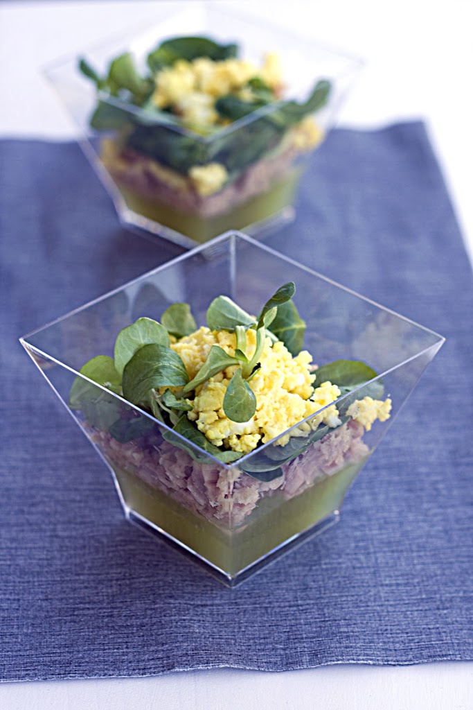 Mettere a bagno la gelatina secondo le istruzioni della confezione, nel frattempo sbucciare i cetrioli tagliarli a metà e togliere i semi. Mettere i cetrioli nella centrifuga e ricavarne il succo. Mettere metà del succo in un pentolino e portare ad ebollizione, togliere dal fuoco ed aggiungere la gelatina strizzata. A questo punto unire anche il succo di cetriolo che era stato lasciato da parte, aggiungere il succo di un lime e se necessario un po’ di sale. Distribuire nei bicchierini e mettere in frigorifero. Quando la gelatina si è solidificata e prima di portare in tavola comporre i bicchierini a piacere. Io ho aggiunto del tonno, poi dell’insalatina condita con olio sale e senape e per finire un uovo sodo sbriciolato.
