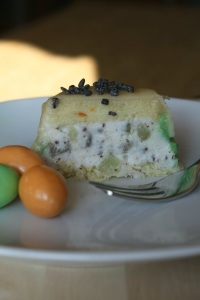 Tagliare i canditi a dadini e spezzettare il cioccolato. Lavorare a crema la ricotta con lo zucchero, incorporare il liquore, i canditi e il cioccolato. Foderare quattro stampini individuali con la pellicola trasparente (io ho usato gli stampini in alluminio usa e getta). Stendere il marzapane bianco con un mattarello e ricavare quattro dischi di diametro superiore a quello degli stampini mentre da quello verde ricavare 4 strisce alte poco meno degli stampini. Disporre sul fondo degli stampini il marzapane bianco e rivestire le pareti con quello verde. Foderare il fondo e parte dei lati dello stampino con le fettine sottili di colomba. Versare all’interno dello stampo la farcia di ricotta, coprire con una fettina di colomba. Riporre in frigorifero e lasciar riposare le cassatine per 12 ore. Sformare le cassatine, eliminare la pellicola trasparente e servire, spolverando a piacere con del cioccolato fondente grattugiato, arancio candito oppure con una ciliegina candita.