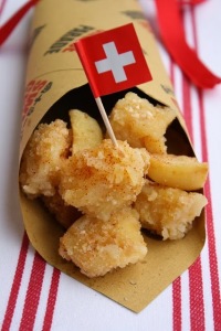 Capita che, per “colpa” di un Contest, Svizzera e Inghilterra si ritrovino protagoniste di un curioso gioco culinario in cui a farla da protagonista è lo Street Food (il cibo da strada), in quest’ultimo periodo particolarmente e (giustamente) celebrato. In Tv, in città, in libreria, agli happening per gastro-appassionati è un trionfo di cibo da strada: dalla piadina alla pizza al taglio, dagli arrosticini abruzzesi alle olive all’ascolana, tutti parlano di cibi street. Appena abbiamo letto l’argomento del Contest in questione (“Swiss Cheese Parade”), in cui veniva richiesto di utilizzare i Formaggi della Svizzera per creare una ricetta a tema streef food subito abbiamo pensato a Londra e allo street food per eccellenza: il Fish&Chips. Abbiamo deciso di utilizzarlo come spunto per la nostra proposta e ribattezzare la ricetta “Cheese&Chips”. Per prepararla abbiamo usato lo Sbrinz, formaggio particolare, dalla consistenza simile a quella del parmigiano reggiano, particolarmente digeribile e privo di lattosio. Lo Sbrinz nasce dal latte (pregiato) delle mucche di razza bruna che pascolano libere nei Cantoni della Svizzera centrale e nelle regioni dei Cantoni di Argovia, Berna e San Gallo: dei 34 caseifici che producono lo Sbrinz, dieci sono caseifici alpini. Inutile dire quanto sia golosa questa versione “svizzero-formaggiosa” del “fish&chips”: l’abbiamo proposta a un aperitivo con amici, servendola proprio nei coni di carta, e abbinata a una birra rossa. Successone!