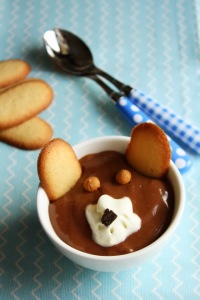 Preparare la crema: mescolare con le fruste elettriche i tuorli con lo zucchero. Aggiungere l’amido di mais (setacciandolo), il cacao (sempre setacciandolo) e la Nocciolata. Intanto intiepidire il latte al microonde e aggiungerlo a filo al composto di uova, mescolando. Versare il composto di uova in un pentolino, mettere sul fuoco e far cuocere la crema per cinque o sei minuti. Una volta fuori da fuoco, mescolare ancora la crema con le fruste elettriche. Versare la crema in 3 coppette e lasciar raffreddare. Completare la crema con un paio di lingue di gatto e, a piacere, con un ciuffetto di panna montata e dei piccoli amaretti o delle nocciole per creare la faccina di un “orsetto”.