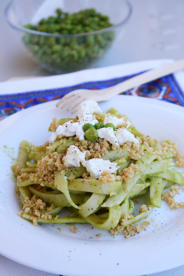 Fettucce con crema di piselli, crumble di nocciole e burrata