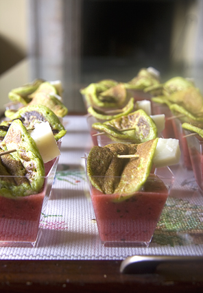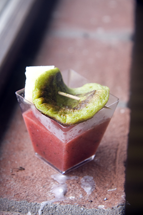 Insalata liquida di pomodori e fragole con pancake di fave e menta