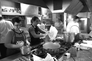 Come vola il tempo! Come vi abbiamo anticipato, insieme ad altre foodblogger, siamo state invitate qualche settimana fa al ristorante Birichin di Torino per partecipare con un nostro piatto al Brunch dell’Atleta. Come potevamo rifiutare un’occasione così prestigiosa per cimentarci in cucina al fianco dello chef “olimpico” Nicola Batavia e della sua brigata? Nicola Batavia, infatti, chef eclettico e originale, è reduce dalle esperienze come chef alla Nike Vip House di Torino 2006 e Beijing 2008. E a luglio cucinerà ancora all’interno della Nike Vip House durante le Olimpiadi di Londra 2012. Tema del brunch, dunque, per ricollegarsi al ruolo olimpico dello chef, nuovo erede della cucina salutare nel mondo, era proprio quello dell’atleta e dello sport. Per mantenere la forma fisica e migliorare le proprie prestazioni l’allenamento, da solo, non basta: alimentarsi bene è altrettanto importante perché il cibo è il primo carburante del corpo e della mente. Per chi fa sport il brunch non può che essere sostanzioso ed energetico ma anche sano e leggero, legato alla dieta mediterranea. E la fantasia in cucina, come ben sappiamo, può rendere gustosi anche i piatti più sani. Abbiamo così pensato a un concentrato di frutta e verdura, un pieno di vitamine, con qualche “sana” proteina. Traduzione: un’insalata liquida di pomodori e fragole con pancake di fave e menta e cubetti di pecorino. L’insalata liquida, su suggerimento dello chef, è stata servita in originali… provette (sì proprio le provette di vetro strette e lunghe, usate in medicina…): l’effetto era strano, come potete immaginare, complice anche il bel color rosso vivo dell’insalata liquida. La nostra idea di partenza era invece quella di servire l’insalata liquida nei bicchierini, con uno spiedino con un pancake e cubetti di pecorino sul bordo del bicchiere. Lavorare in una cucina professionale è stata un’esperienza molto particolare, faticosa ma insieme gratificante e affascinante. Splendido poi conoscere finalmente di persona alcune food blogger e ritrovarne altre (come la dolcissima Ambra). Insieme a noi “carambole” erano presenti ai fornelli i blog Cucina SenzaSenza, Il Gattoghiotto, Gustorie, La fucina culinaria, Q.B. incucina quanto basta, Salto nel Crudo, Shake and bake, Spadelliamo insieme, UnaStraghetta in cucina e Verde Cardamomo.