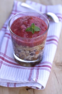 Scrivo una parola che non fa parte del mio vocabolario e spero di non doverla più ripetere: dieta! Parola che detesto perché spesso mi ricorda la mia avversione alle regole imposte! Ma in questi giorni si è resa necessaria. Non è tanto un fattore di salute o estetico, il problema è che non posso mica rifarmi il guardaroba. Se i bottoni non si avvicinano e le cerniere collassano è un danno economico notevole. E poi figuriamoci prima delle vacanze, quando tutto è proiettato all’acquisto pro deserto e avventura. Quindi da qualche giorno qualche accortezza in più nella mia alimentazione e qualche privazione of course. Per esempio eliminazione dei dolci, vino e birra, poca pasta e tanta frutta e verdura. Chiaramente nel weekend via libera a tutto altrimenti che vita è. Per fortuna il caldo mi viene in soccorso, e l’avvicinarsi delle tanto desiderate ferie estive anche. Un altro aiuto è arrivato dalla RioMare e dalla proposta di rifare una delle ricette ideate da Marco Bianchi per l’operazione “cucina a tutto tonno”. Nella mia versione pranzo light ho utilizzato le insalatissime orzo farro e tonno per un bicchierino estivo che si è tinto di rosso per l’abbinamento ad una salsa di pomodori, lamponi e menta.