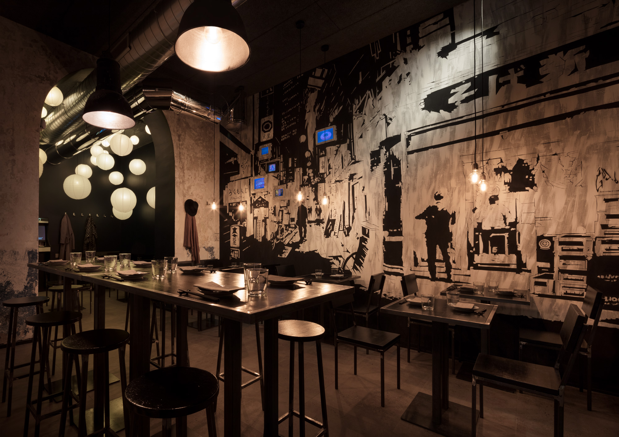 Al centro della sala del bar si staglia un peculiare lampadario, realizzato con uno scola bottiglie francese d’epoca usato dai vignaioli per lavare le bottiglie di vino. Una sorta di corsetto zincato, al cui interno sono state inserite magnum di sakè che divengono diffusori di luce filtrata dai vetri e dagli ideogrammi delle etichette: una installazione che celebra i migliori sakè del Giappone. Nella seconda sala è stato realizzato un grande murales dal giovane street artist Alessandro Di Vicino in arte Gaudio visibile sin dall’esterno attraverso la vetrata, che grazie a dei monitor ricrea l’atmosfera delle luci al neon tipiche delle strade di Tokio.