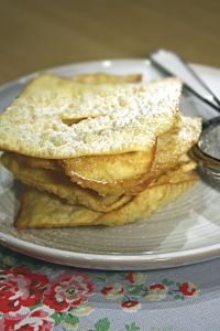 Non amo il Carnevale, o meglio, proprio non è uno dei miei periodi dell’anno preferiti. C’è però una cosa che mi legherà sempre piacevolmente al Carnevale: le chiacchiere di mia nonna. Ecco: se c’è un sapore dell’infanzia a cui sono legata con tutto il cuore è proprio quello delle chiacchiere…Mia nonna Franca ne preparava una valanga, riempiendo tutti i contenitori e i cestini di vimini della casa…Però, non so perché, non era mai l’ora di mangiarle. Così, me lo ricordo bene, il mio divertimento supremo era sgattaiolare verso la credenza e riempirmi le mani di quelle sottilissime e profumatissime delizie sottili…Quante ne ho mangiate! Ahimé, però, lo zucchero a velo lasciava tracce inequivocabili così la sfida era delicatissima e credo di aver affinato una tecnica perfetta per mangiarle senza lasciare segni di zucchero a velo sul pavimento della nonna…Che bel periodo… Ah, questa è la ricetta della nonna Franca: buone, di più, però quelle che prepara lei per me sono…inarrivabili! Buon Carnevale a tutti!