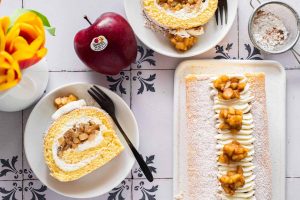 Ideale come dessert della domenica o per la tavola delle Feste, questo rotolo è una coccola irresistibile, da gustare freddo e da decorare con panna e mele speziate per un tocco scenografico che non passerà inosservato.