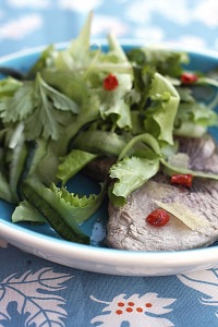 Mettete in un pentolino l’acqua, lo zucchero , il succo di mezzo limone, il peperoncino tagliato a pezzi e lo zenzero a fettine. Fate bollire finché non si scioglie lo zucchero poi spegnete. Nel frattempo in una padella cuocete il tonno con un goccio di olio e un po’ di sale. Preparate l’insalata aggiungendo il cetriolo tagliato a julienne, e le foglie di coriandolo. Servite il pesce aggiungendo la glassa di zenzero e l’insalata che potrà essere condita solo con olio o con la glassa. Dosate zenzero e peperoncino secondo la vostra tolleranza al piccante!