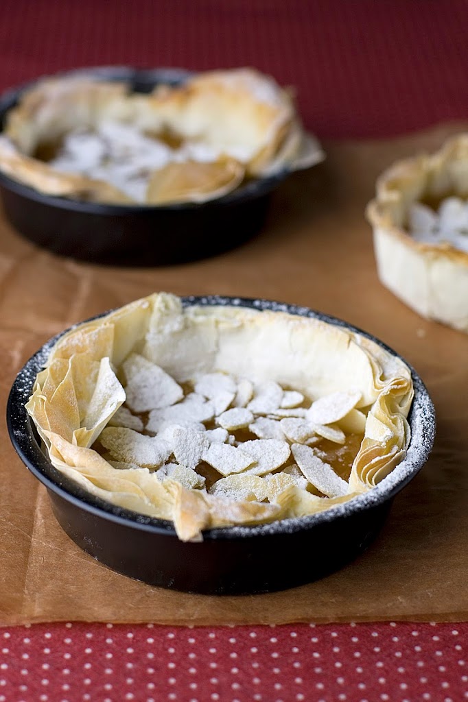 Fare dei cerchi con la pasta fillo più fogli sovrapposti. Rivestire degli stampini Tagliare un pezzetto di pasta di mandorle a forma di cerchio e stenderla sottile. Posizionare la pasta di mandorle all’interno, spalmate la marmellata e aggiungete le mandorle a lamelle. Mettete in forno a 180° per 15 minuti circa.