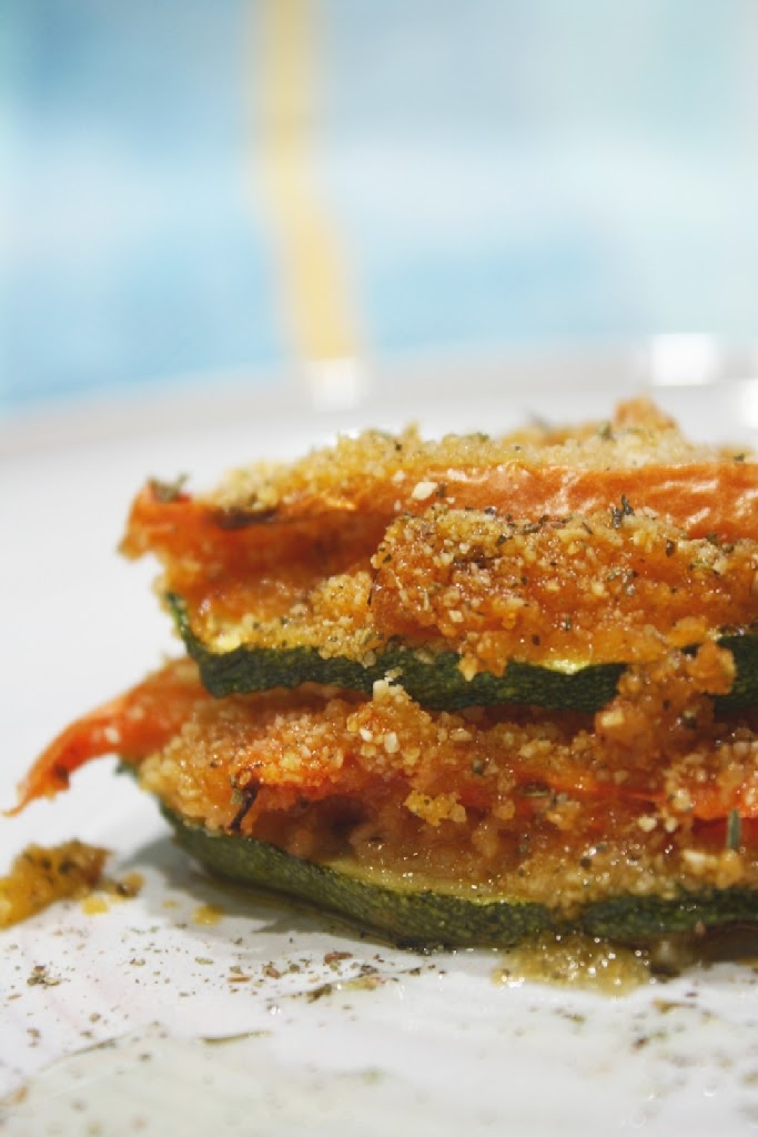Improvvisare (letteralmente) la cena: è una situazione che mi capita sempre più spesso, ultimamente…Ieri sera trovo in frigorifero delle zucchine tonde (dimenticate, poverine…) e dei pomodori cuore di bue: che faccio? Mi si accende una lampadina… Avevo visto su un vecchio numero della Cucina del Corriere della Sera una ricetta del Tian provenzale (verdure gratinate al forno con erbe aromatiche). La ricetta originale prevedeva anche le melanzane e, se non ricordo male,  la mollica di pane. Io ho rielaborato a modo mio e ne è uscita questa torretta di verdure con pangrattato ed erbe provenzali (acquistate al mercatino di Vence quest’estate…) che mi ha salvato la cena: perfetto accompagnamento per una (ottima) mozzarella di bufala. Da tener presente. Per la cronaca, il tian prende il nome dal recipiente di terracotta in cui vengono cotte le verdure. Ecco: io non lo possiedo e ho usato una classica teglia da forno Pyrex…