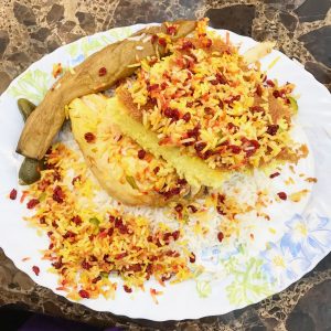 ZERESHK POLO riso basmati al vapore guarnito con bacche rosse (Zereshk) che viene accompagnato dal pollo allo zafferano.