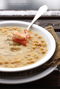 Mettete a mollo i ceci in acqua fredda per 12 ore circa (seguite le istruzioni della confezione se ci sono). Risciacquate sempre con acqua fredda e metteteli in una pentola con abbondante acqua fredda leggermente salata, fate andare per almeno un’ora e mezza. Quando sono pronti frullatene la maggior parte e tenetene qualcuno intero. Tagliate a dadini cipolla e carote (soffritto) e fatele rosolare con un po’ di olio in una pentola capiente, aggiungete i ceci frullati e non , il rosmarino e se si asciuga troppo allungate con il brodo, e aggiustate di sapore. Quando i ceci si sono insaporiti spegnete il fuoco. Nel frattempo fate sciogliere a bagnomaria il foie gras allungato con la creme fraiche (dovete ottenere una salsina). Decorate la zuppa di ceci con la salsina al fois gras e decorate con dei gamberi che avrete saltato in padella con un po’ di sale e pepe.