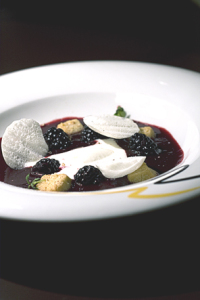 Zuppa di more, gelato allo yogurt e polvere di Fisherman