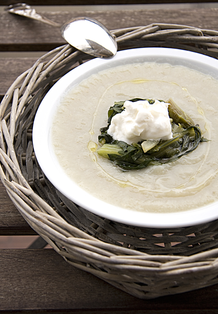 Servite la zuppa di topinambur con un nido di catalogna al centro ed un pezzetto di burrata.