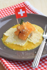 Della serie “non si finisce mai di imparare”… voi lo sapevate che lo Sbrinz è il formaggio più antico d’Europa? Viene prodotto addirittura da cinque secoli nei cantoni della Svizzera centrale. L’ho scoperto grazie al Contest “La Svizzera nel piatto”, che ci ha permesso di conoscere più da vicino i formaggi svizzeri, senza dubbio una delle “eccellenze” dei Ventisei Cantoni: nove formaggi particolari, ciascuno con un diverso carattere poiché lavorati con il latte dei pascoli di zone differenti. Uno di questi, lo Sbrinz, è un buonissimo formaggio DOP (Denominazione di Origine Protetta) a pasta extradura, davvero interessante in cucina: si prepara con latte vaccino fresco non pastorizzato di mucca e grazie a un periodo di stagionatura e maturazione di almeno 16 mesi acquisisce una consistenza particolarmente friabile, è facilmente digeribile e ricco di elementi nutritivi. Io me ne sono innamorata subito, fin dal primo assaggio, con quelle sue belle note piccanti… Ho pensato di usarlo per re-interpretare una classica ricetta della mia famiglia, tipica della tradizione gastronomica lombarda: i ravioli di zucca. Mia nonna è mantovana e da bimba, confesso, non mi piacevano. Troppo “strani” per i miei gusti di allora. E invece adesso…li adoro! Quando mia nonna li prepara per me è una festa. Ovviamente li faccio spesso anch’io ma i miei non sono buoni come i suoi. Questa versione arricchita da una fonduta di Sbrinz allo zafferano e da gustose chips di zucca…devo ammettere che non è male: la preparazione è lunghetta ma…ne vale la pena!